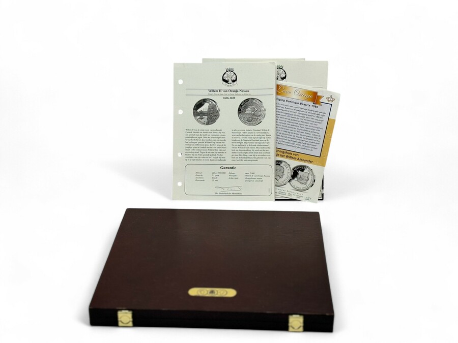 Een cassette gevuld met zilveren munten: Replica 1 Gulden 1867 (31,1 gram, 925/1000) met certificaat, met daarbij replica 1 Gulden 1944 en 1 Gulden 1680. Drie munten, Maurits, Beatrix, en Willem...