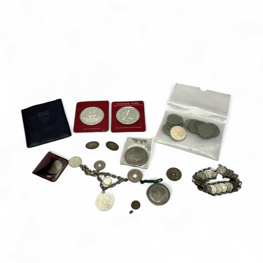Lot divers muntgeld, waaronder zilveren armband gemaakt van 10 cent muntjes, twee zilveren munten Netherlands Antilles 25 Gulden 1976 en een zilveren penning met opschrift ‘Arrondissements Recht...