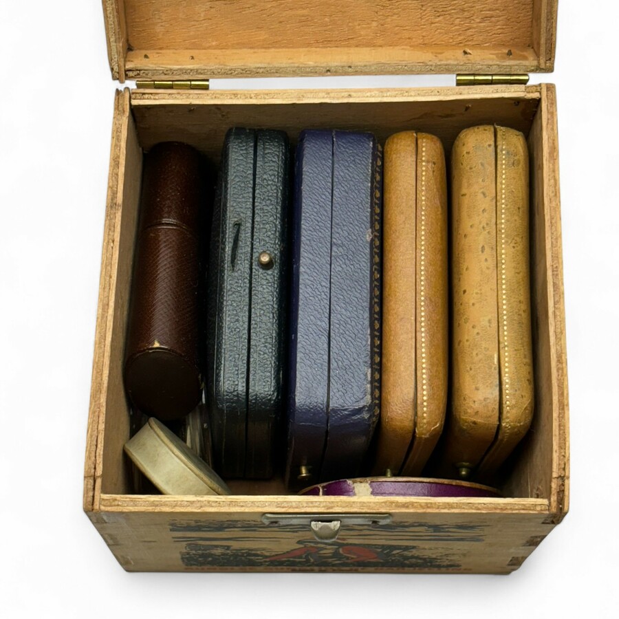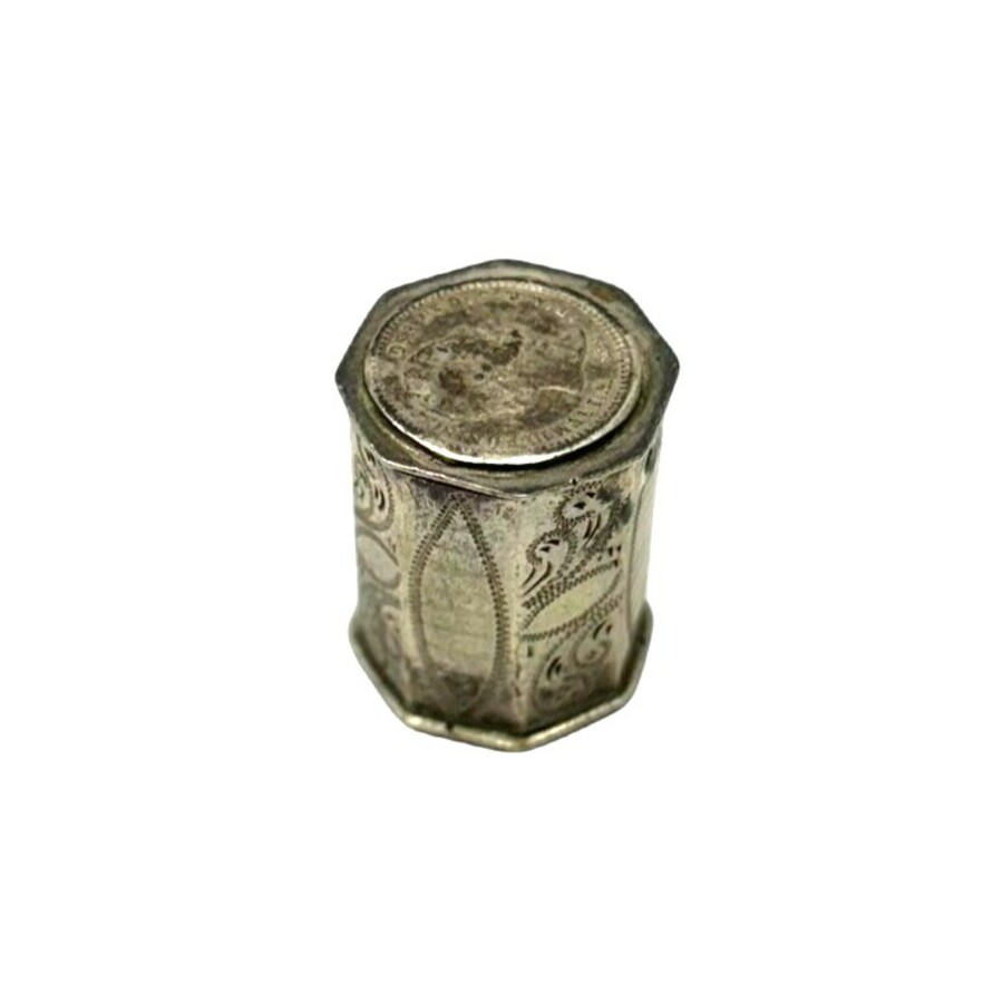 Een antiek tweede gehalte (835/1000) zilveren achtkantig muntdoosje met op de deksel en de bodem een zilveren Willem III stuiver. Hierin zeven zilveren stuivers Willem III 1850.
