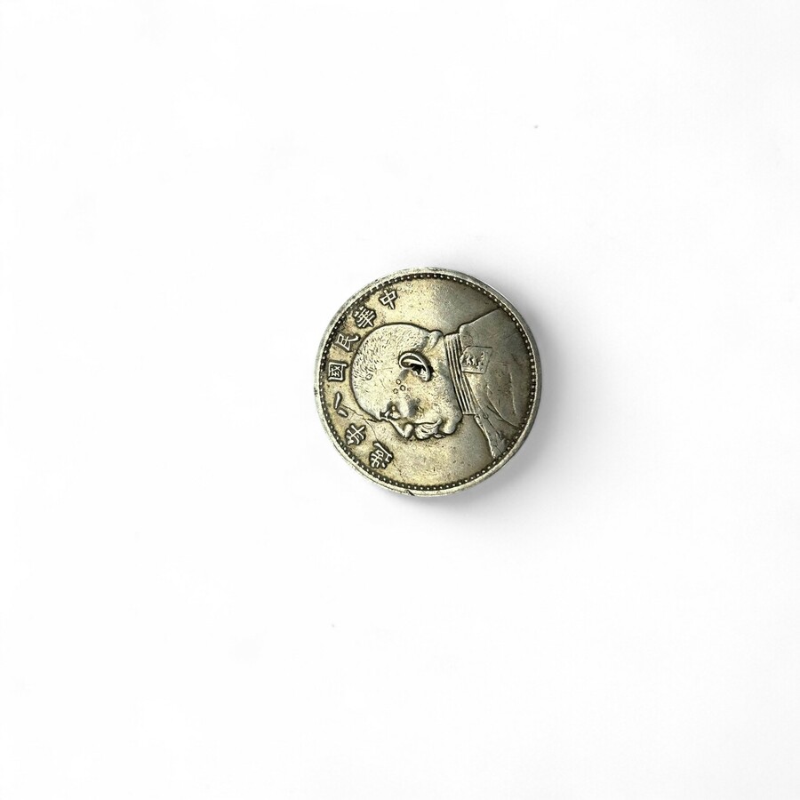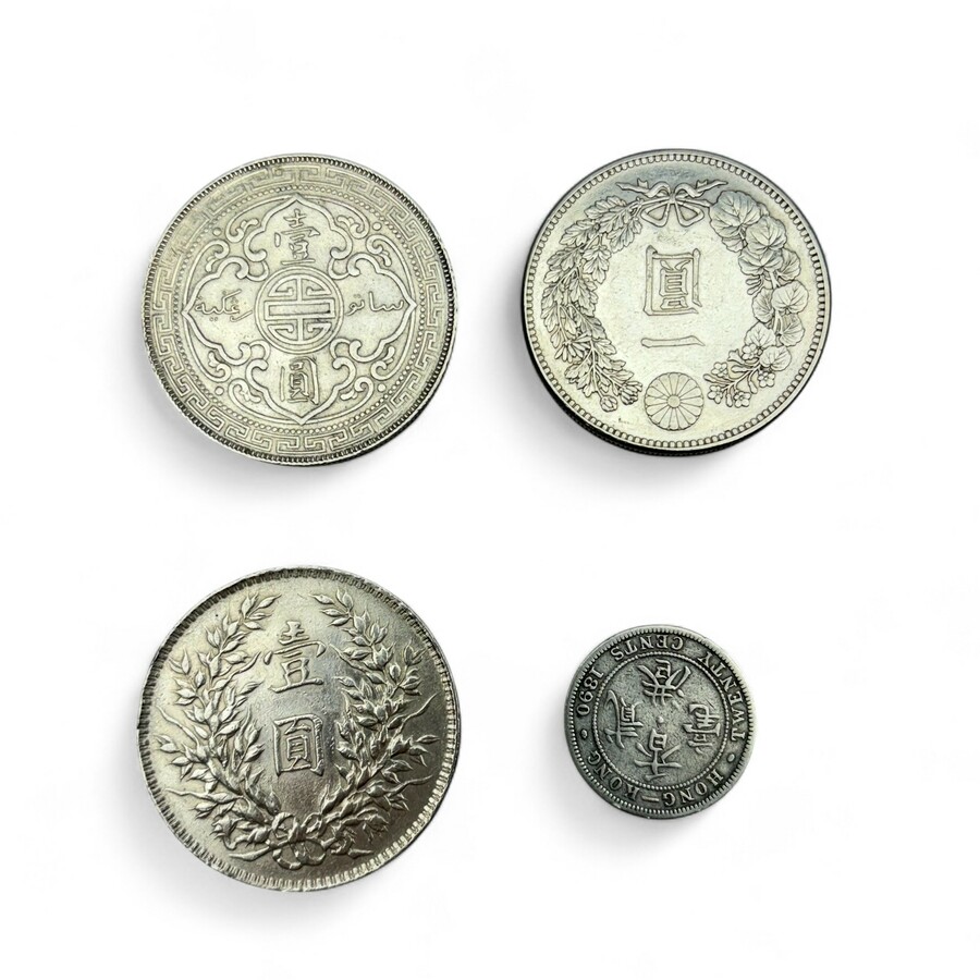 Lot van vier Aziatische munten: één met opschrift '416 one Yen 900', decor van een draak, één met voorstelling van een keizer en Chinese tekst, één met opschrift 'Hong Kong Twenty Cents 1890' en...
