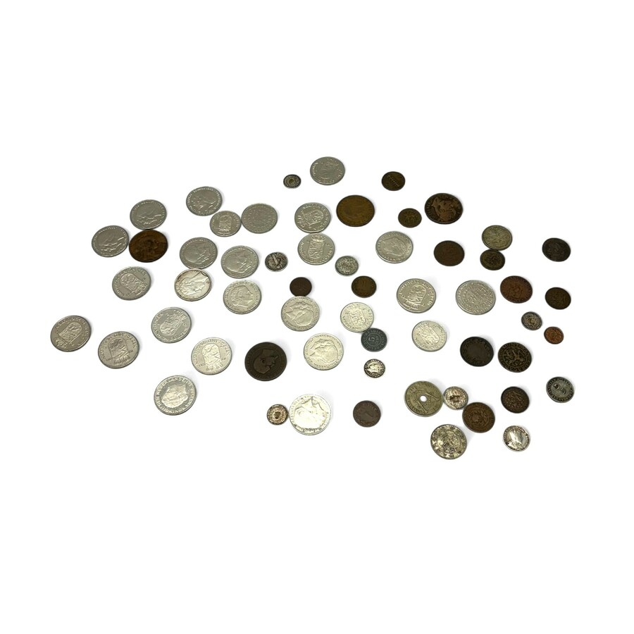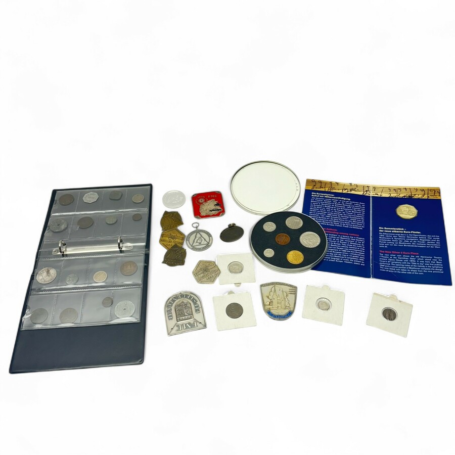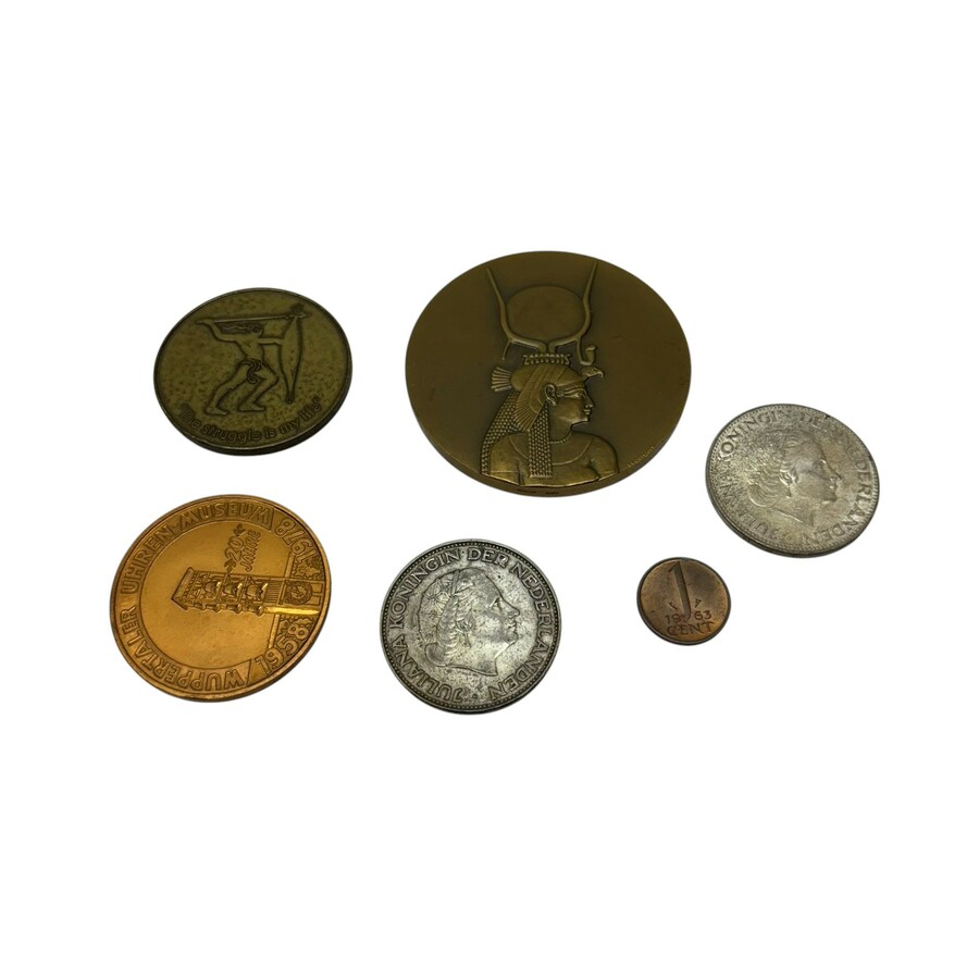 Lot diverse munten en medailles, waaronder een derde gehalte (800/1000) zilveren munt en een 18e eeuwse zilveren munt, 6 Stuivers 1722.