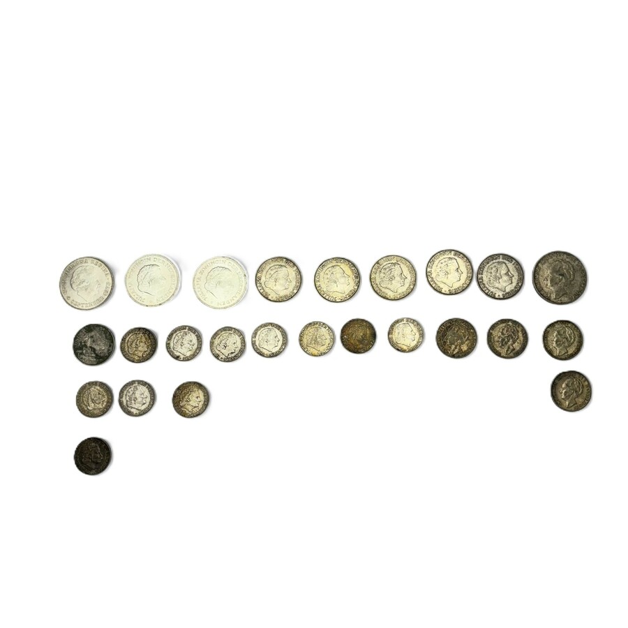 Lot zilveren muntgeld: elf zilveren Guldens, 1954-1957, vier zilveren Gulden, 1922 en 1931, Rijksdaalder 1970, vijf Rijksdaalders 1960-1961, Rijksdaalder 1932 en drie zilveren Tientjes 1970