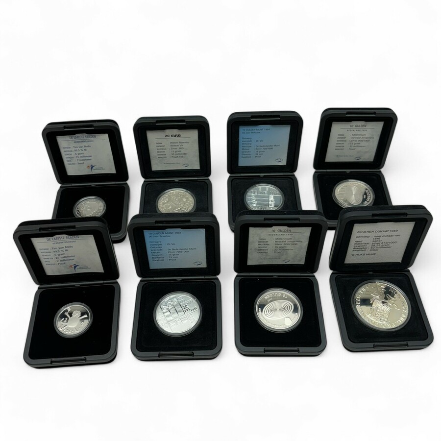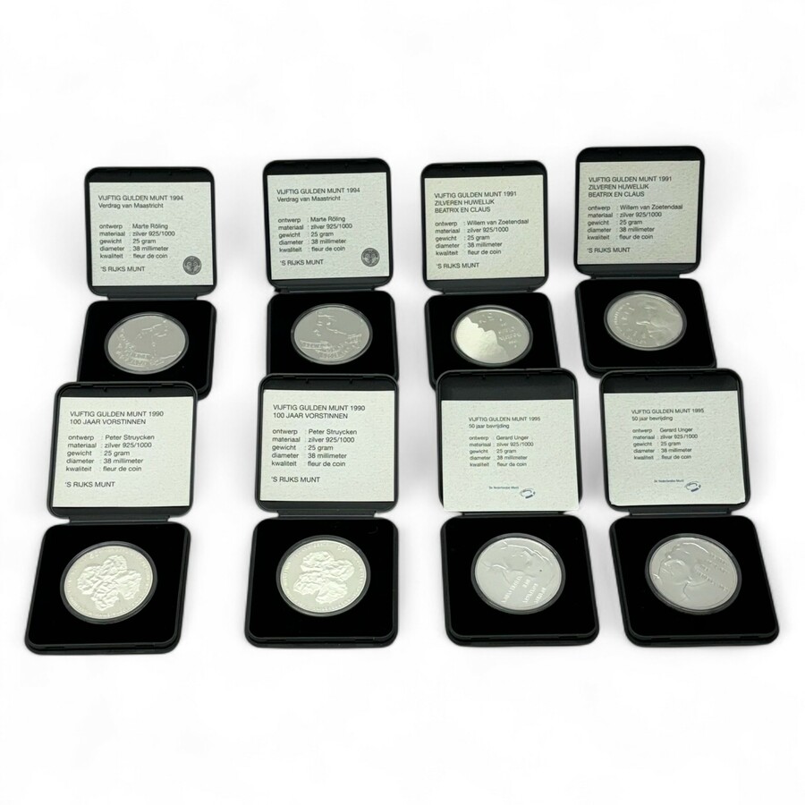 Lot van acht eerste gehalte (925/1000) zilveren 50 Gulden munten in cassettes, diverse edities: '100 Jaar Vorstinnen' uit 1990 (2x), 'Zilveren Huwelijk Beatrix en Claus' uit 1991 (2x), 'Verdrag ...