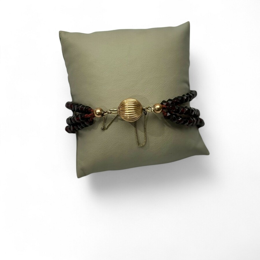 Een drierijig granaten armbandje met 14 karaats (585/1000) geelgouden bolslot