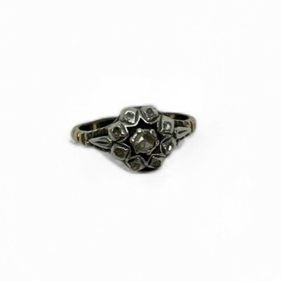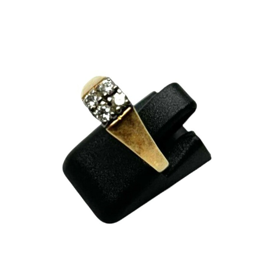 Een 20e eeuwse 14 karaats (585/1000) geelgouden damesring, bezet met vier briljant geslepen diamantjes in witgouden setting. Gemerkt ‘585’ in de binnenrand.