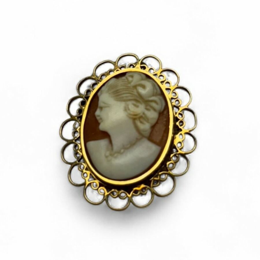 Een 20e eeuwse 14 karaats (585/1000) geelgouden hanger, ovaal model, met ovale camee, damesbuste. Met oogje en speld. Gemerkt ‘585’ op de sluiting.