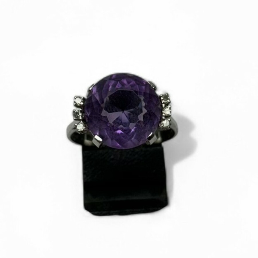 Een 14 karaats (585/1000) witgouden solitairring met grote geslepen amethist en zes briljantjes.