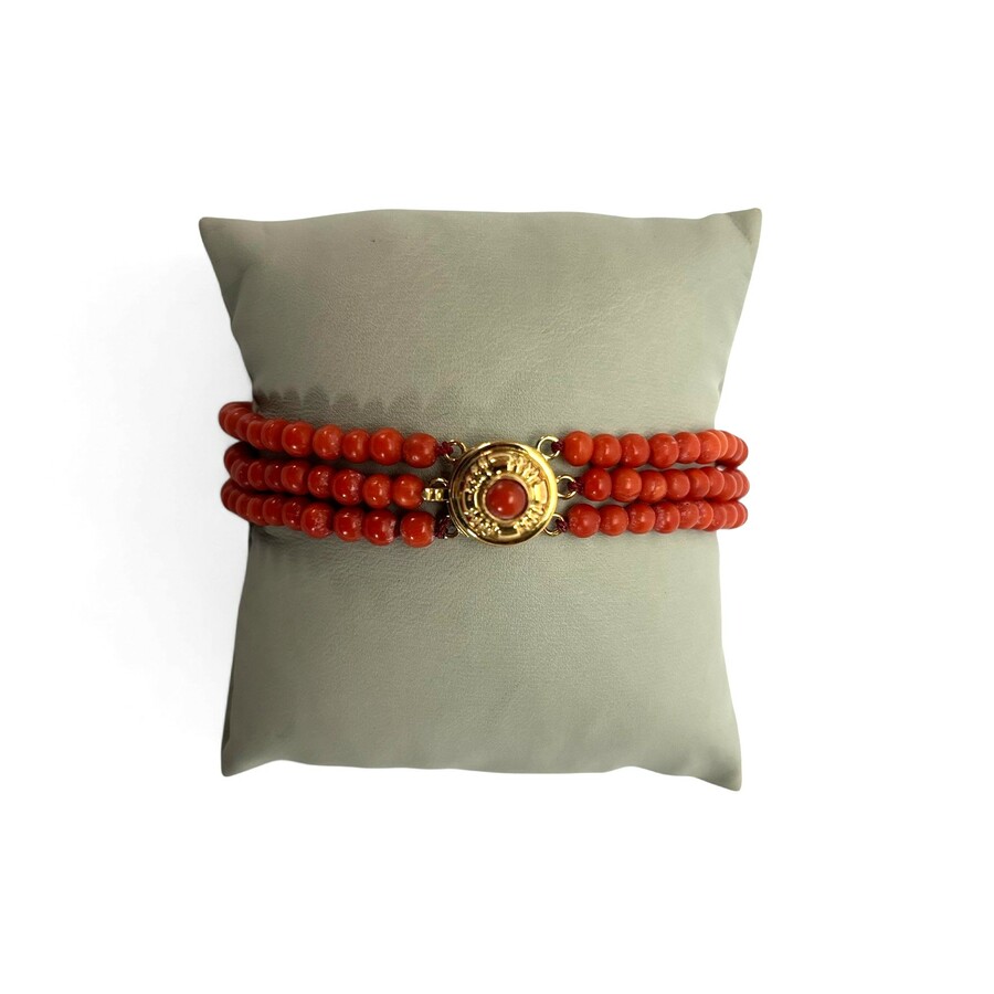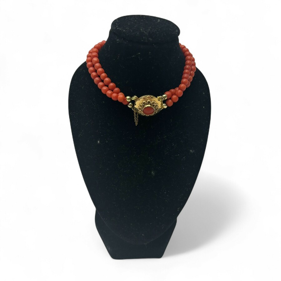 Een twee rijgig bloedkoralen armband aan een 14 krt (585/1000) gouden slot met een cabuchon geslepen bloedkoraal.