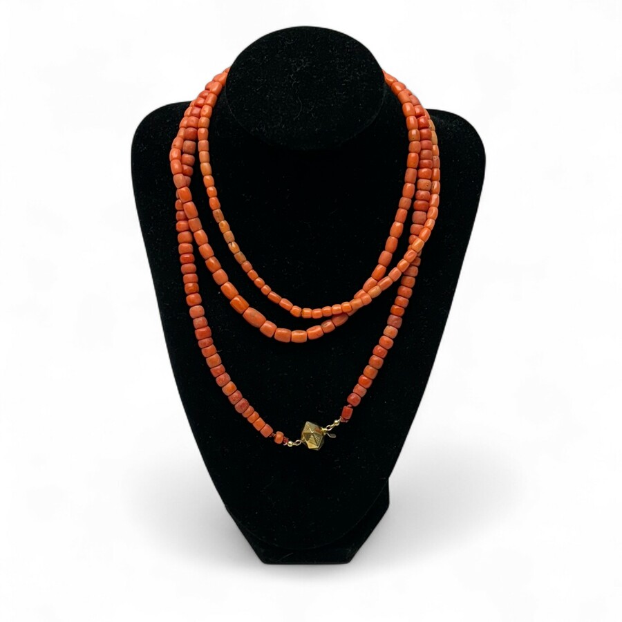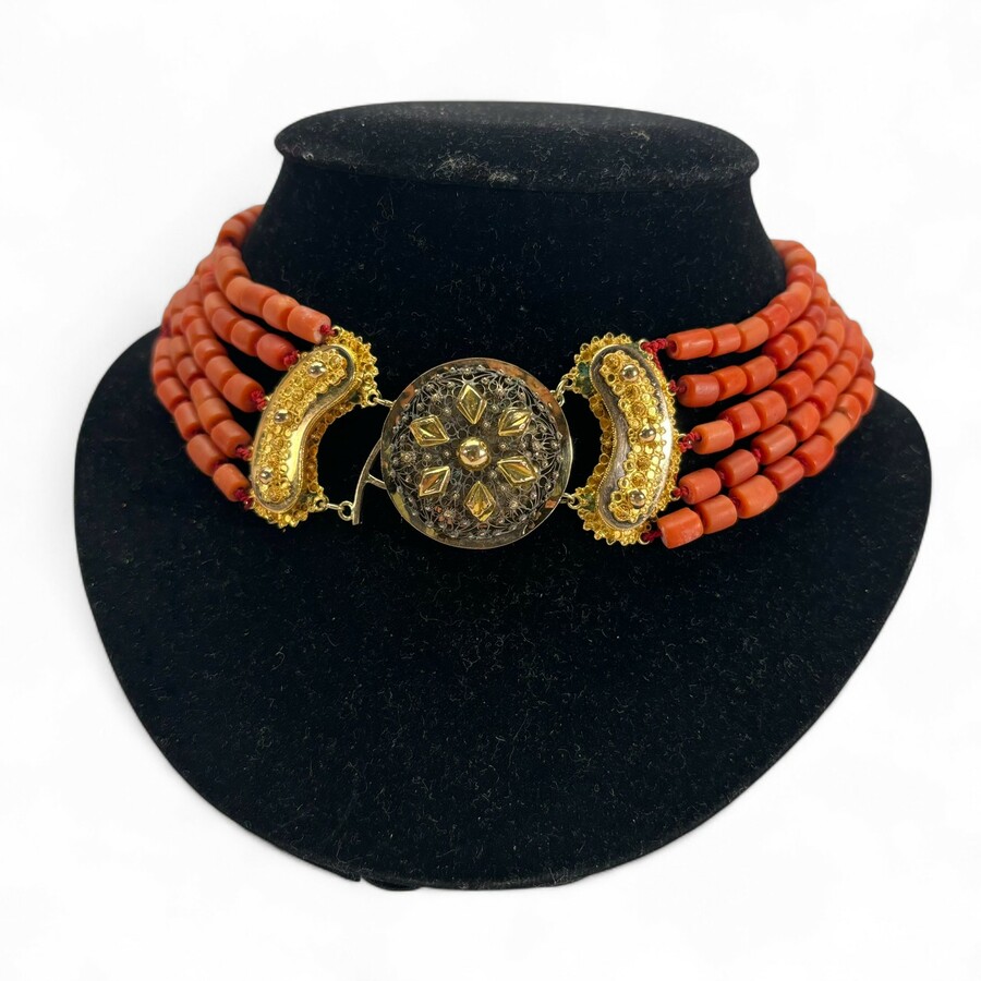 Een antiek 19e eeuws bloedkoralen collier, vijfrijig, met 14 karaats (585/1000) geelgouden slot, filigrain bewerkt.