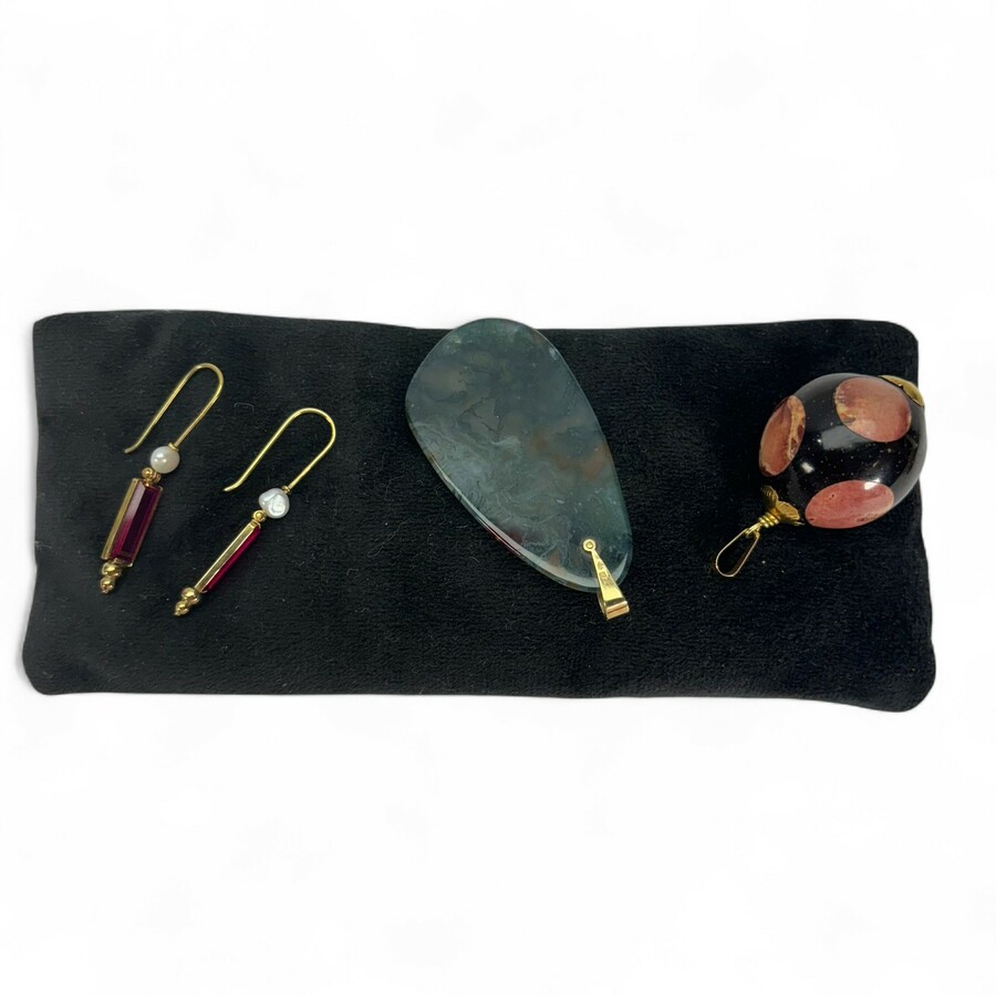 Lot divers: een stel 20e eeuwse oorknoppen, met parel en paarse glassteen, en twee hangers, waarvan één met 14 karaats (585/1000) geelgouden montuur