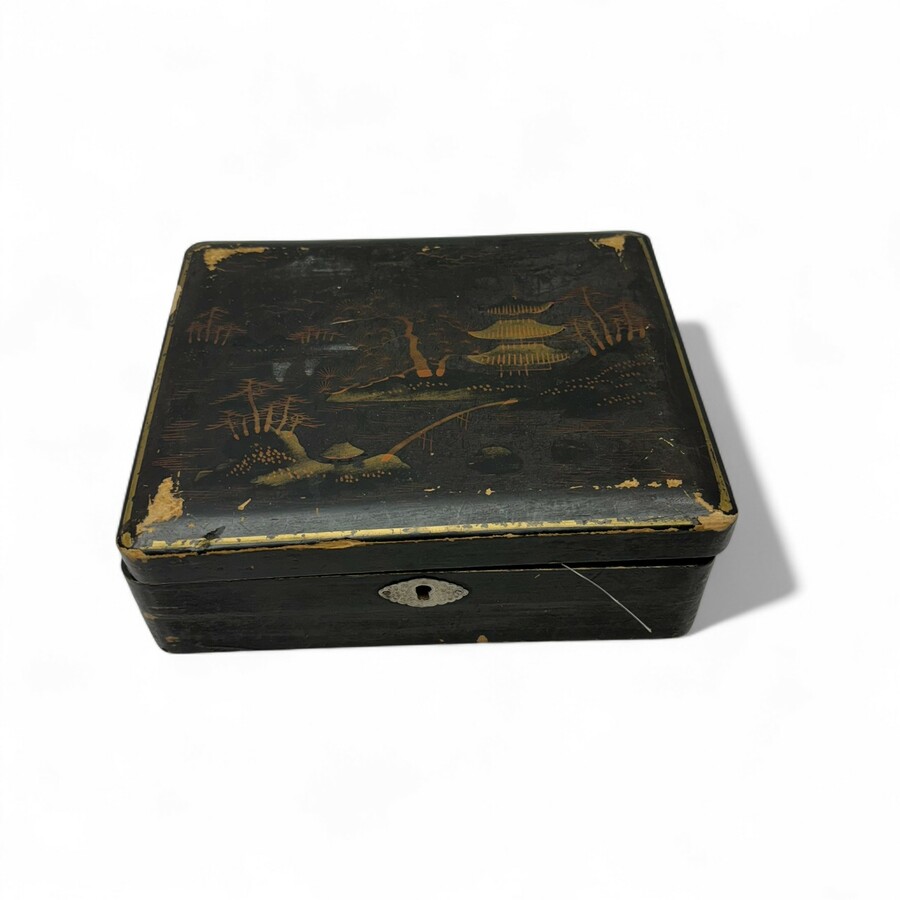 Japans lakwerken kistje met geslepen granaat en kornalijnen kralen. Hierin een 14 krt (585/1000) gouden oorhanger en een slot.