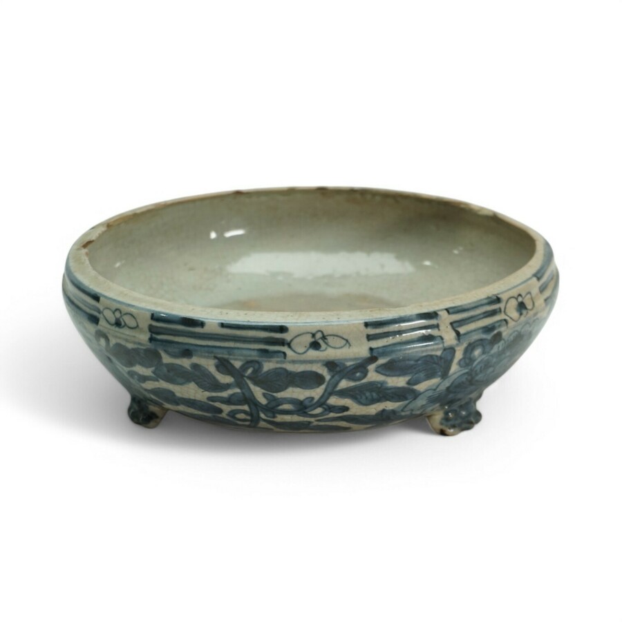 Een antieke Chinees swatow porseleinen wierookbrander, driepoots, met onderglazuur blauw beschildering, uit de late Ming dynastie (1368-1644).