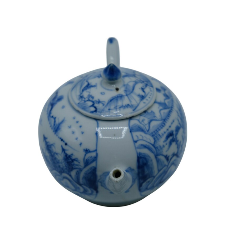 Een Chinees porseleinen theepot, Qianlong periode. Blauw/wit met een decor van een oosterse landschap met wandelende figuur.