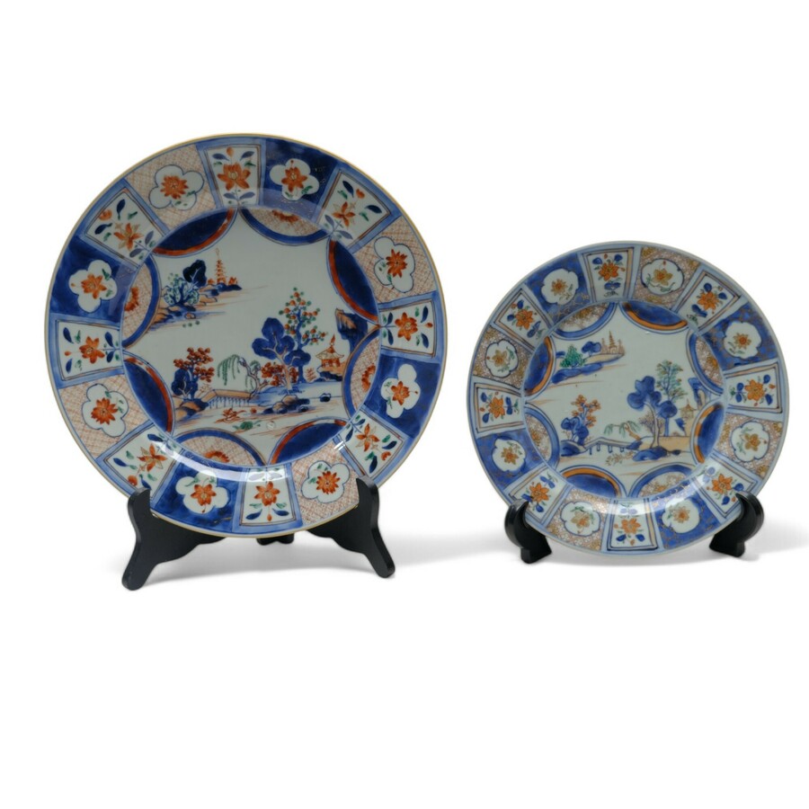 Lot divers 18e eeuws Chinees porselein: een vroeg 18e eeuws blauw-wit bord met 'vajra' symbool, een blauw-wit bord met bamvoe en bloemen op een rots bij een hekwerk en een imari bord, centraal m...