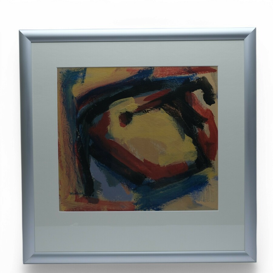 Schilderij, gouache op papier. Abstracte compositie in rood, zwart, blauw en geel. Linksonder gesigneerd Wim van der Veer (Leeuwarden, 1939).