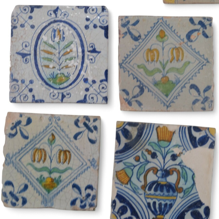 Lot van 17 antieke 17e eeuwse tegels, polychroom met bloemmotieven. Met beschadigingen en/of gerestaureerd.