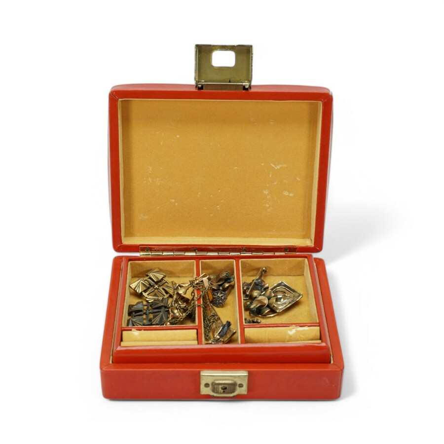 Rood sieradenkistje gevuld met diverse bijoux en naaigerei.