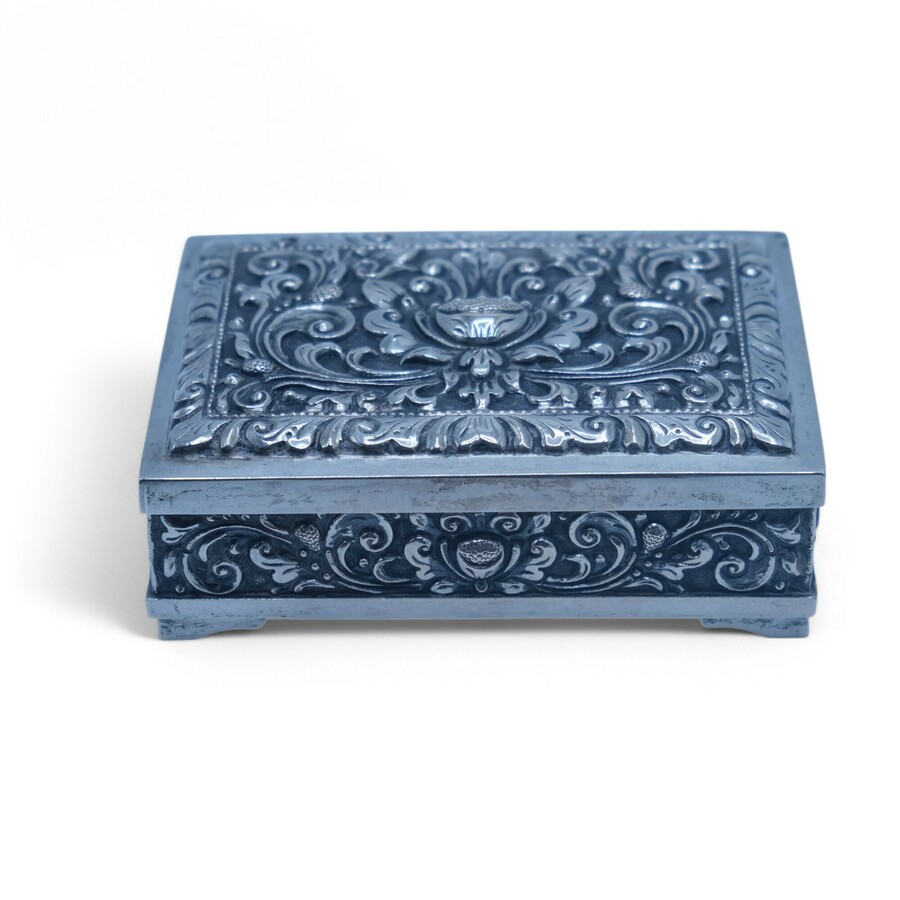Een 20e eeuwse djokjazilveren (800/1000) sigarettendoos, Indisch met houten inleg. Aan de onderzijde gemerkt ‘800’ en ‘SD’.