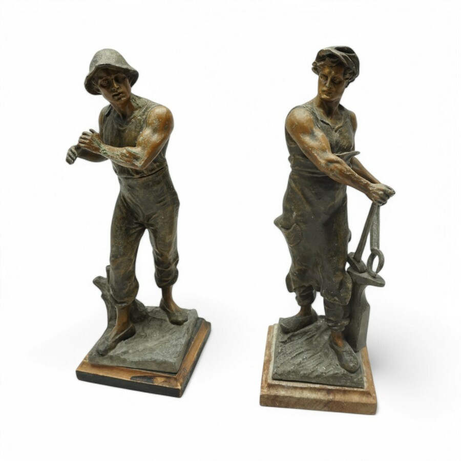 Lot van twee laat 19e eeuwse Franse zamakken sculpturen op houten basements, o.a. voorstelling van een smid met een tang.