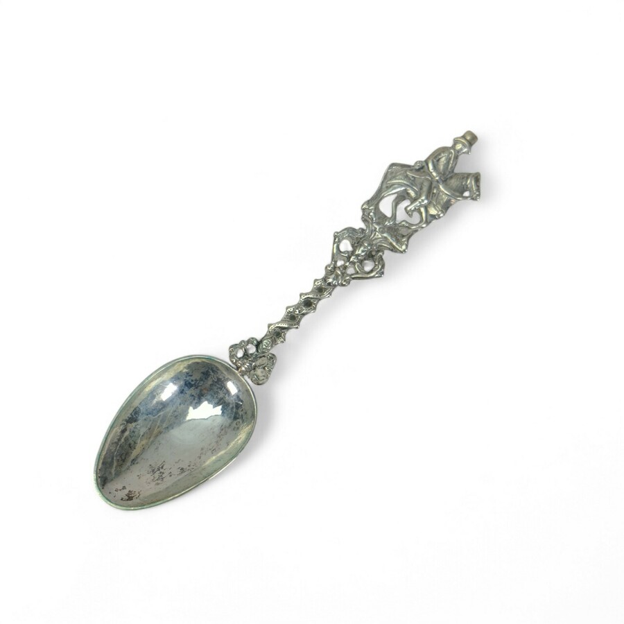 Een antieke 19e eeuwse tweede gehalte (835/1000) zilveren geboortelepel, met getorste steel, bekroond met ruiter te paard. Met inscriptie ‘Japikje Tjatzes Talsma is geboren den 21 september 1854...