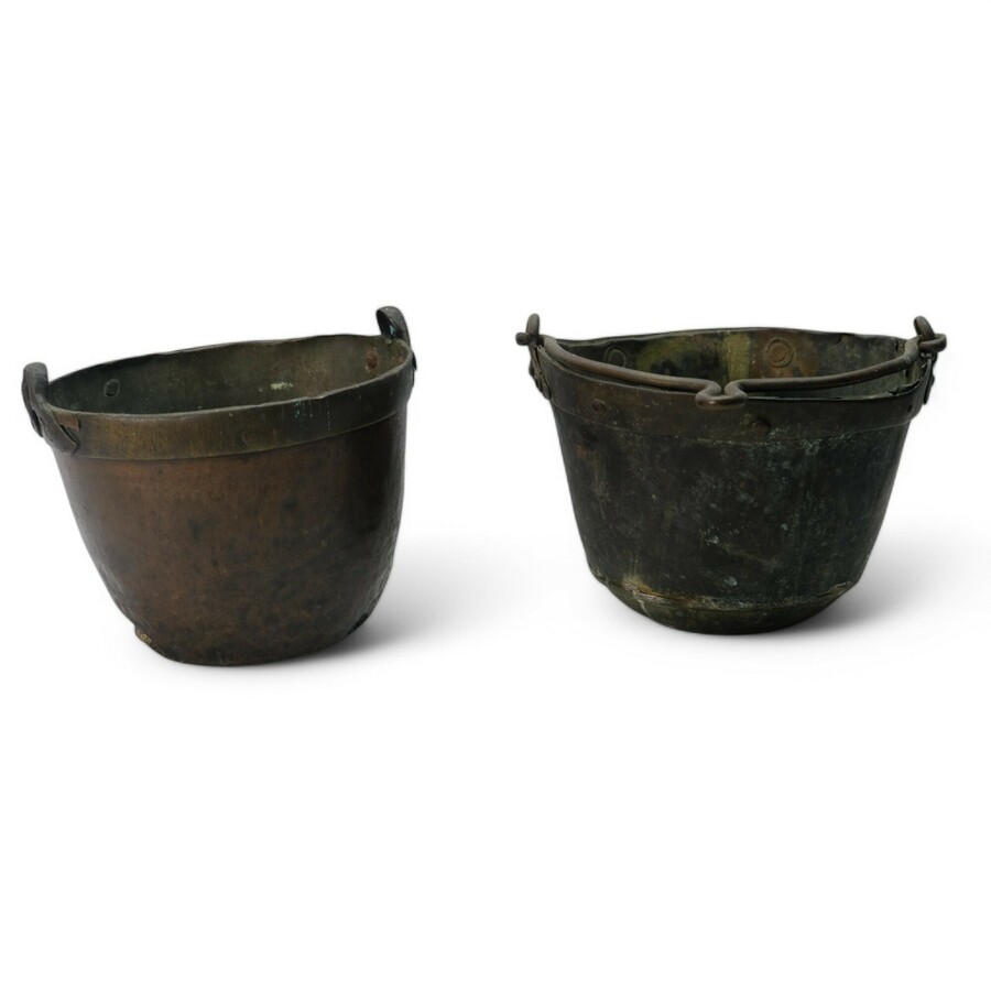 Twee antieke koperen putsemmers, waarvan één met hengsel en ketting, een pijpkomfoor en twee hartvormige bakvormen.
