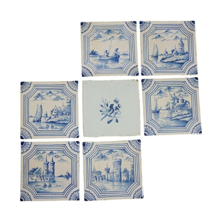 Lot antieke tegels, waaronder een 18e eeuwse bloemtegel en zes blauw-witte tegels, mogelijk Westraven