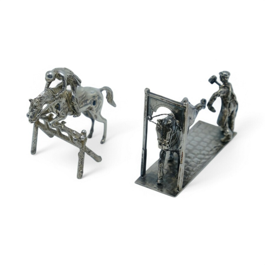 Lot van twee zilveren miniaturen: een 20e eeuws tweede gehalte Italiaans (835/1000) zilveren miniatuur van een springruiter, gemerkt ‘835’ en meesterteken ’54 VI’ = Megenatti Fratelli, werkzaam ...
