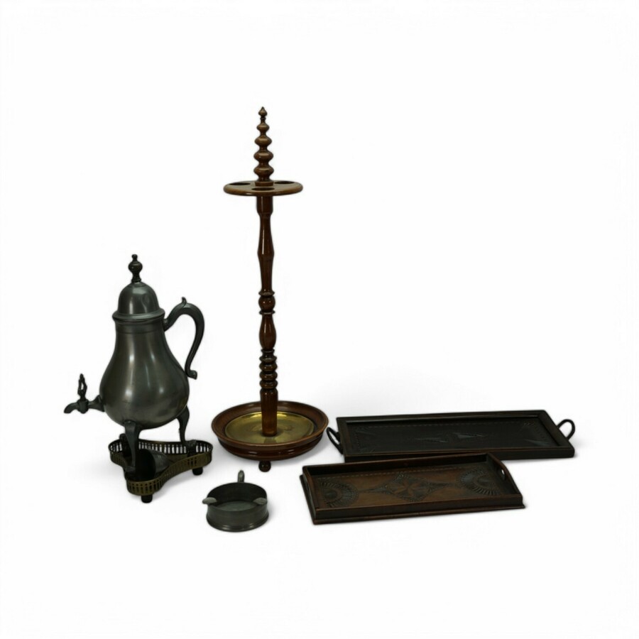 Lot diveren: twee Fries kerfsnee langwerpige dienblaadjes, een 19e eeuwse Biedermeier standaard voor tabakspijpen, tinnen asbak en een 20e eeuwse tinnen kraantjeskan.