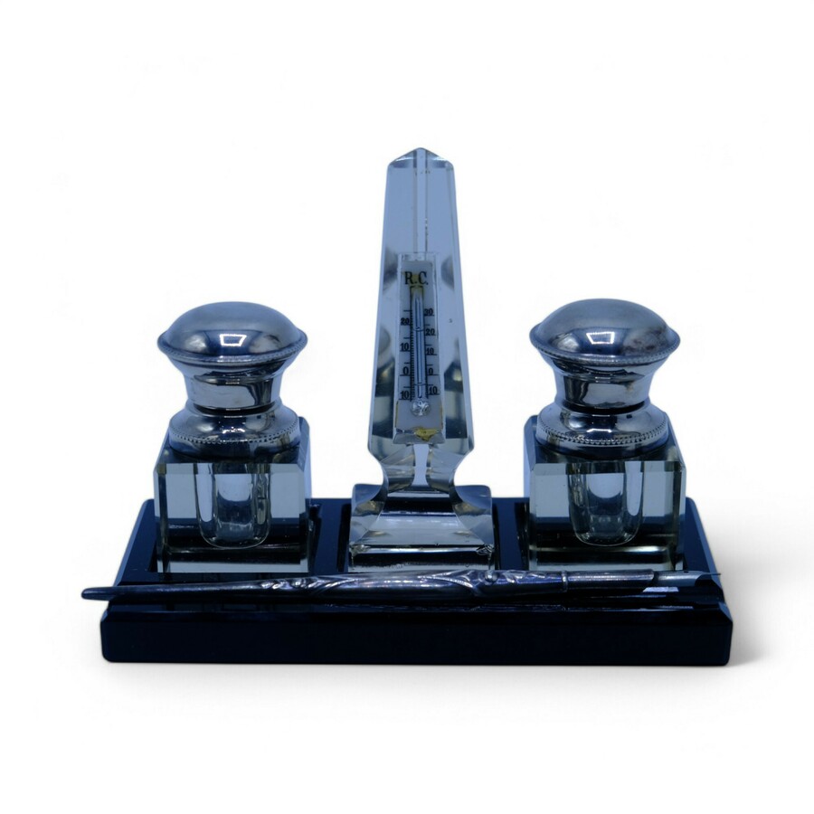 Een vroeg 20e eeuws inkstel met geslepen kristallen inktpotjes met tweede gehalte (835/1000) zilveren hals en dop, centraal een kristallen thermometer, met daarbij een eerste gehalte (925/1000) ...