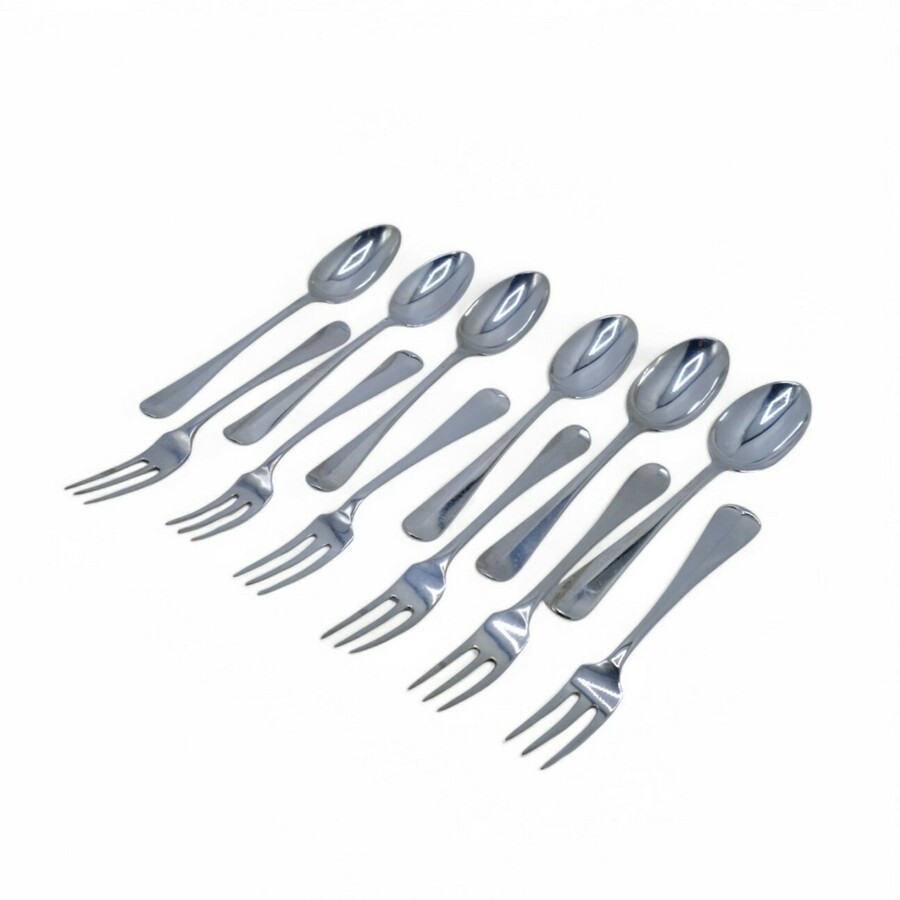 Zes zilveren vorken en zes zilveren lepels.