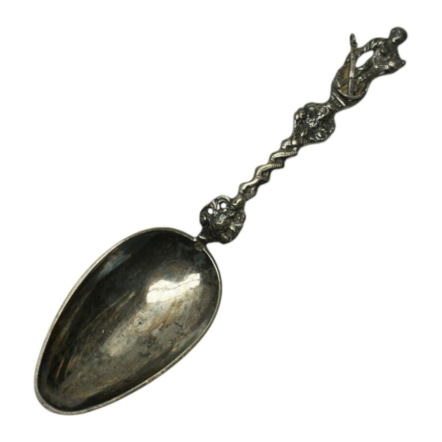 Een 19e of 20e eeuwse tweede gehalte (835/1000) Fries zilveren geboortelepel, getorste steel bekroond met De Liefde. De bak gegraveerd met een kruis en tekst 'Hans Knoll Den 1694'