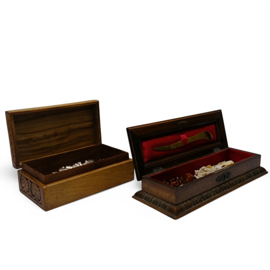 Lot van twee kistjes met divers: één handschoenenkistje gevuld met o.a. brievenopener, benen lepeltjes en een Limoges broche. Met daarbij een Indonesisch kistje met filigrain miniatuur schoenen ...