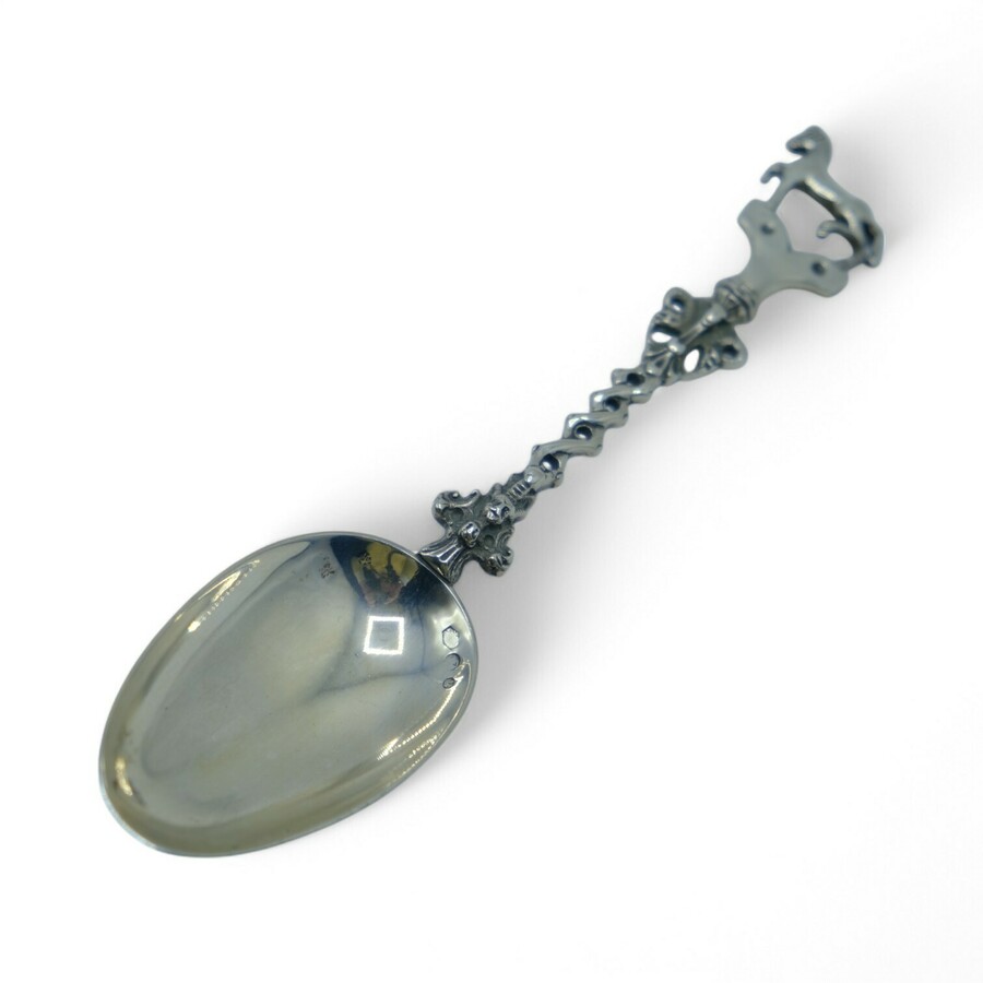 Een 20e eeuwse tweede gehalte (835/1000) Hollands zilveren geboortelepel, eivormige bak en getorste steel bekroond met paard. Gekeurd met lopende leeuw en minervakopje, meesterteken ZZ = Zaanlan...