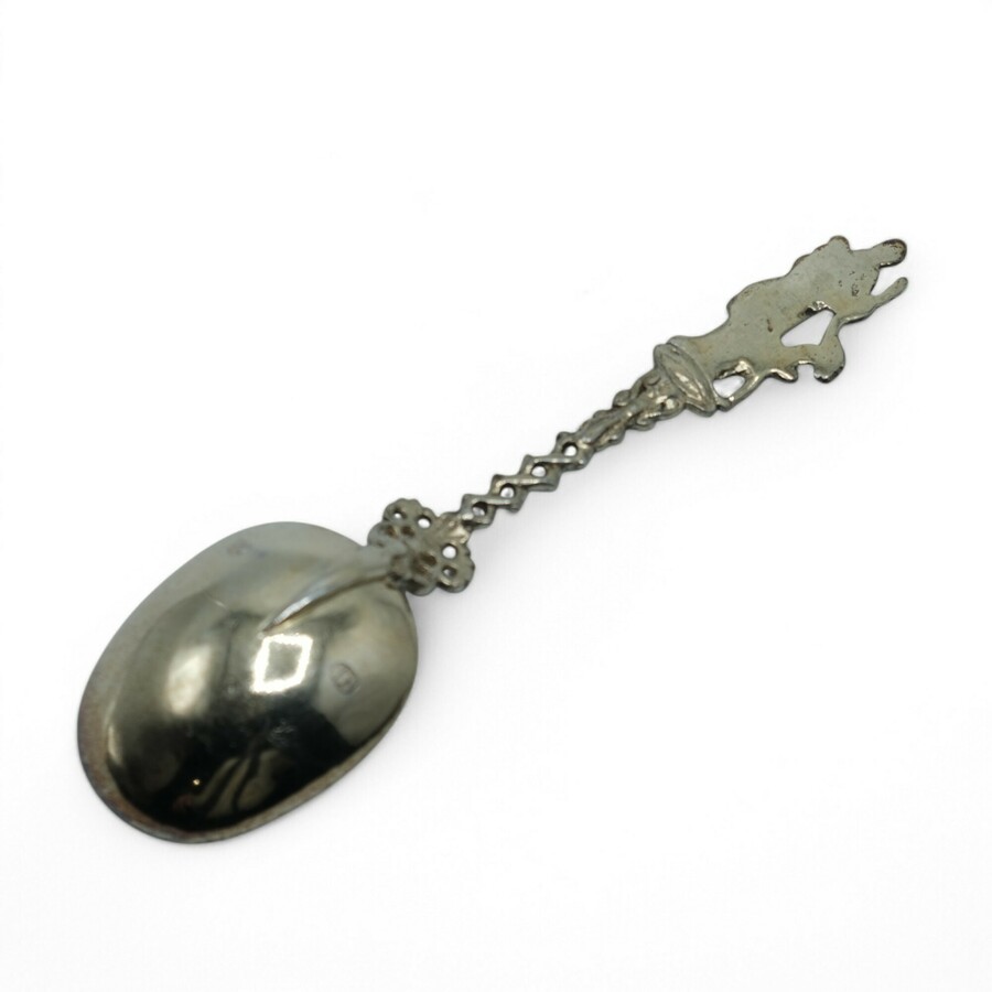 Een antieke tweede gehalte (835/1000) nederlands zilveren sierlepel, met portret van Saksia van Uylenburgh in de bak, getorste steel en bekroond met een windmolen. Gemerkt in de bak, mr. Theodor...