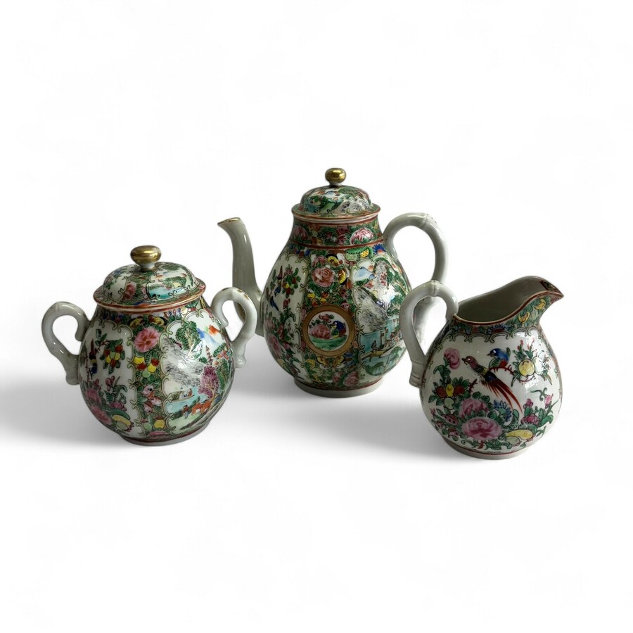 19e eeuwse Kantonese theepot, melkkan en suikerpot