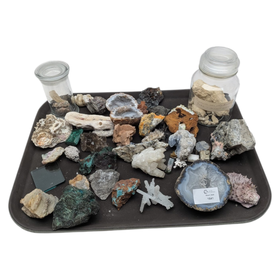 Lot mineralen en ander versteend organisch verzamelwaar, waaronder rutielkwarts
