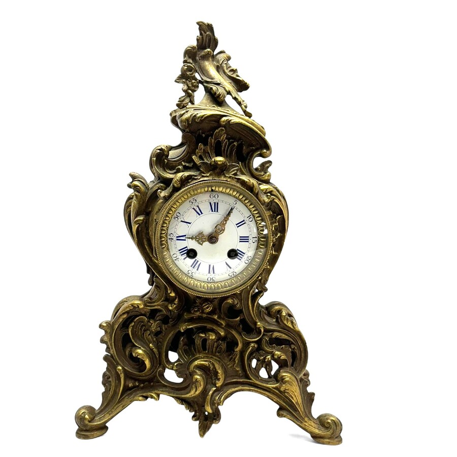 Een 19e eeuws wit marmeren pilaarklok met bronzen apllicaties. Voorzien van een witte emaille wijzerplaat met florale motieven. Met zonneslinger en sleutel.