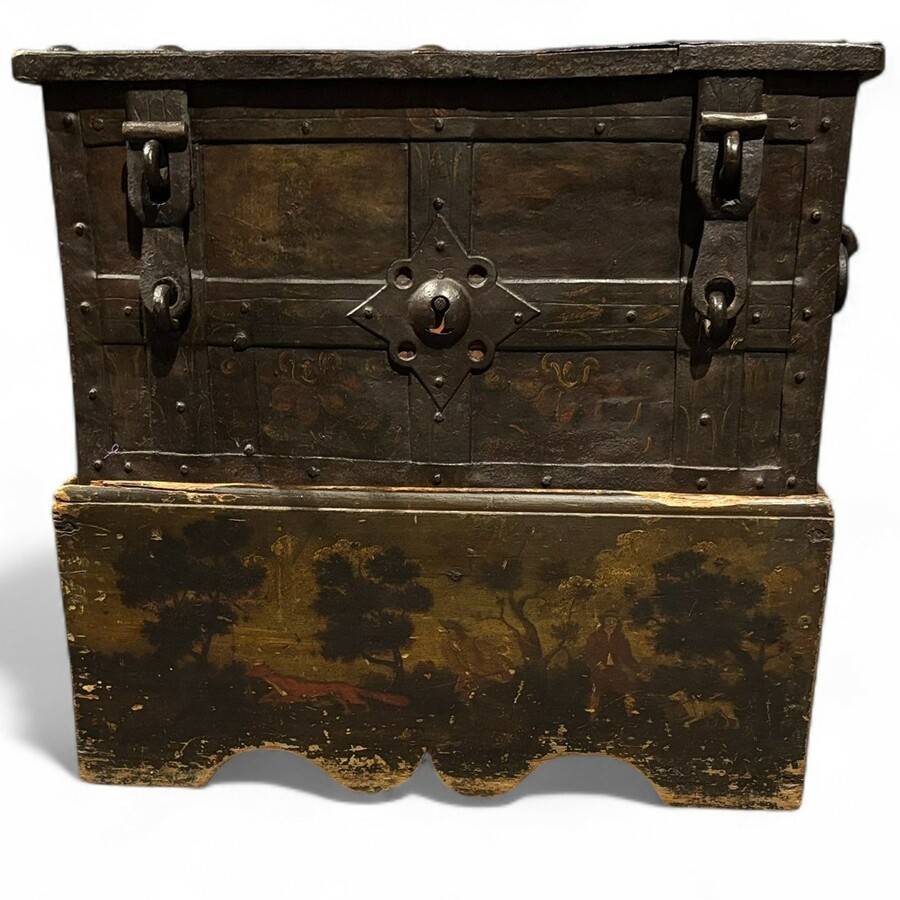 Een 17e eeuwse ijzeren geldkist op houten beschilderde voet