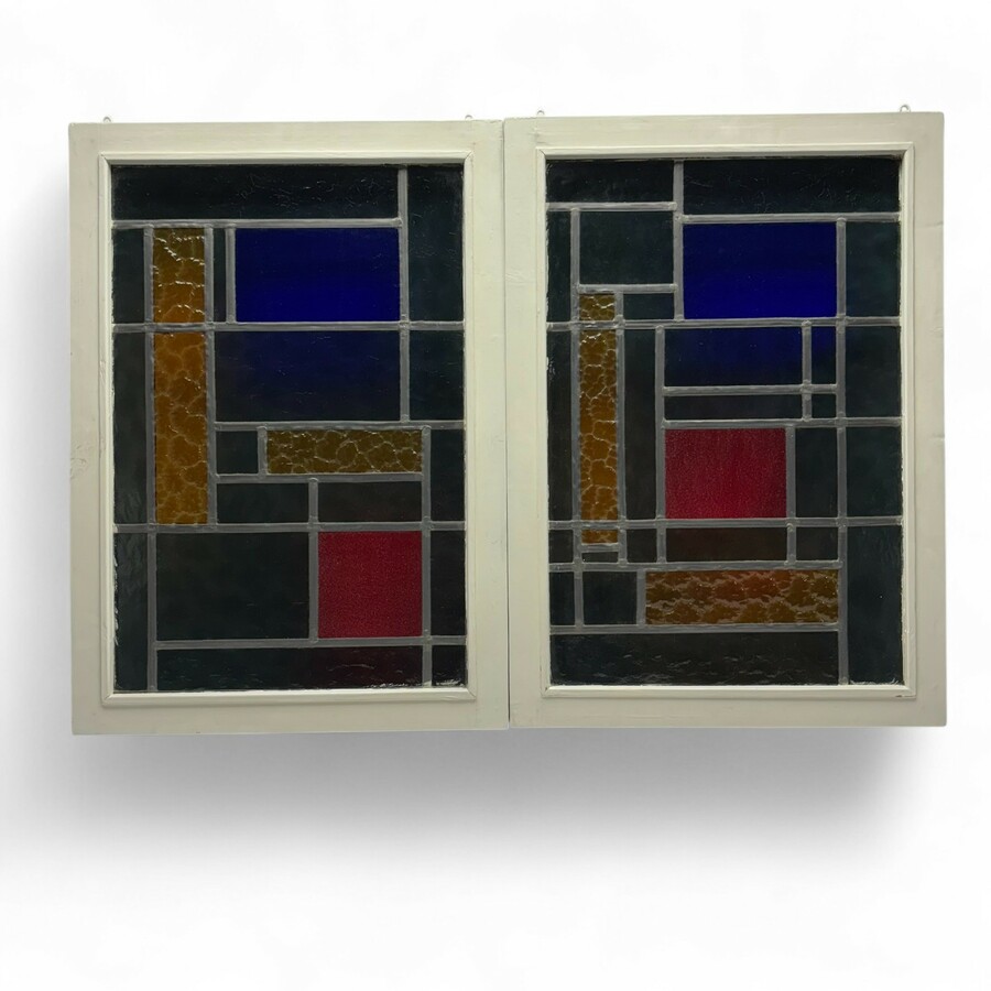Twee glas-in-lood ramen met de Stijl-motieven, ca. 1920.