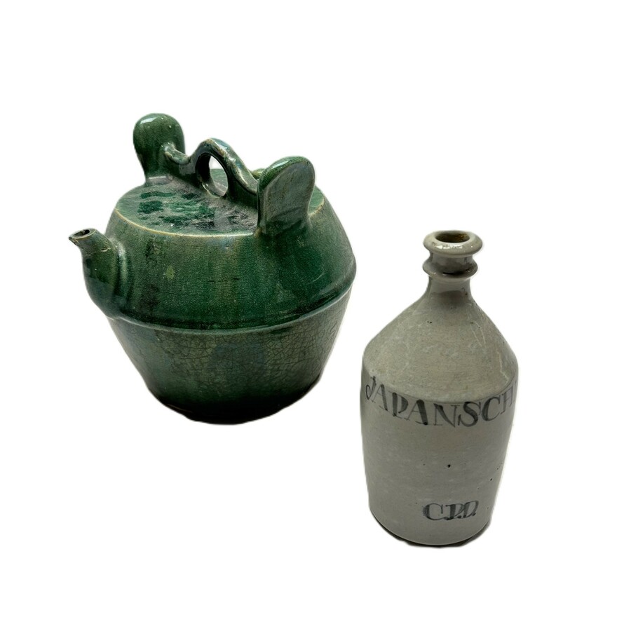 Een Chinees steengoed wijnvat en soya kruikje
