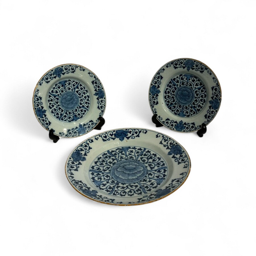 Drie 18e eeuwse Delftse borden en schotels, Porceleyne Bijl 18e eeuw