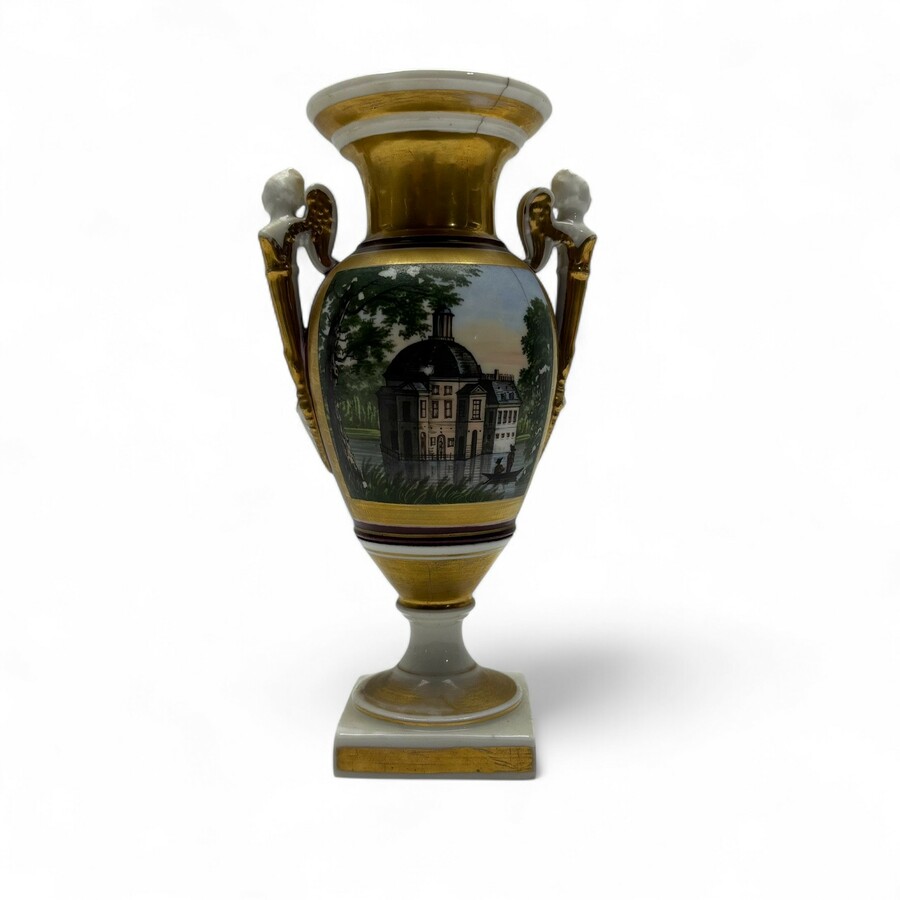 Een Porcelaine de Bruxelles urnvormige vaas met twee oren