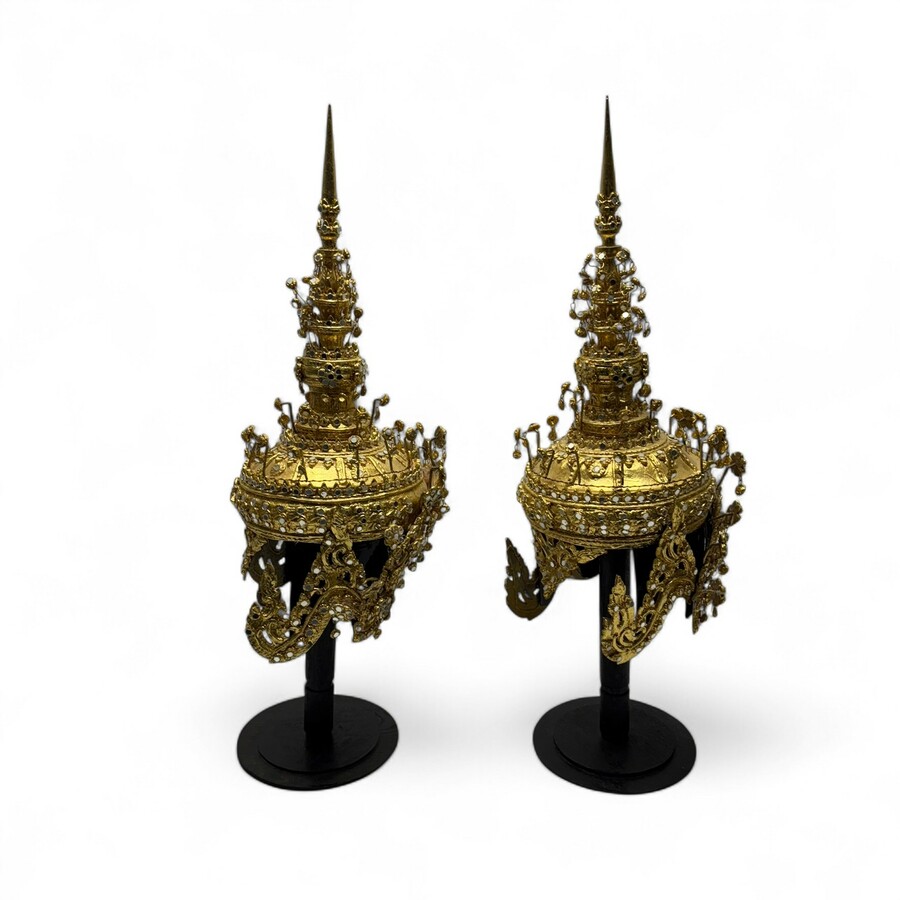 Twee Thaise hout en vergulde hoofdtooien.