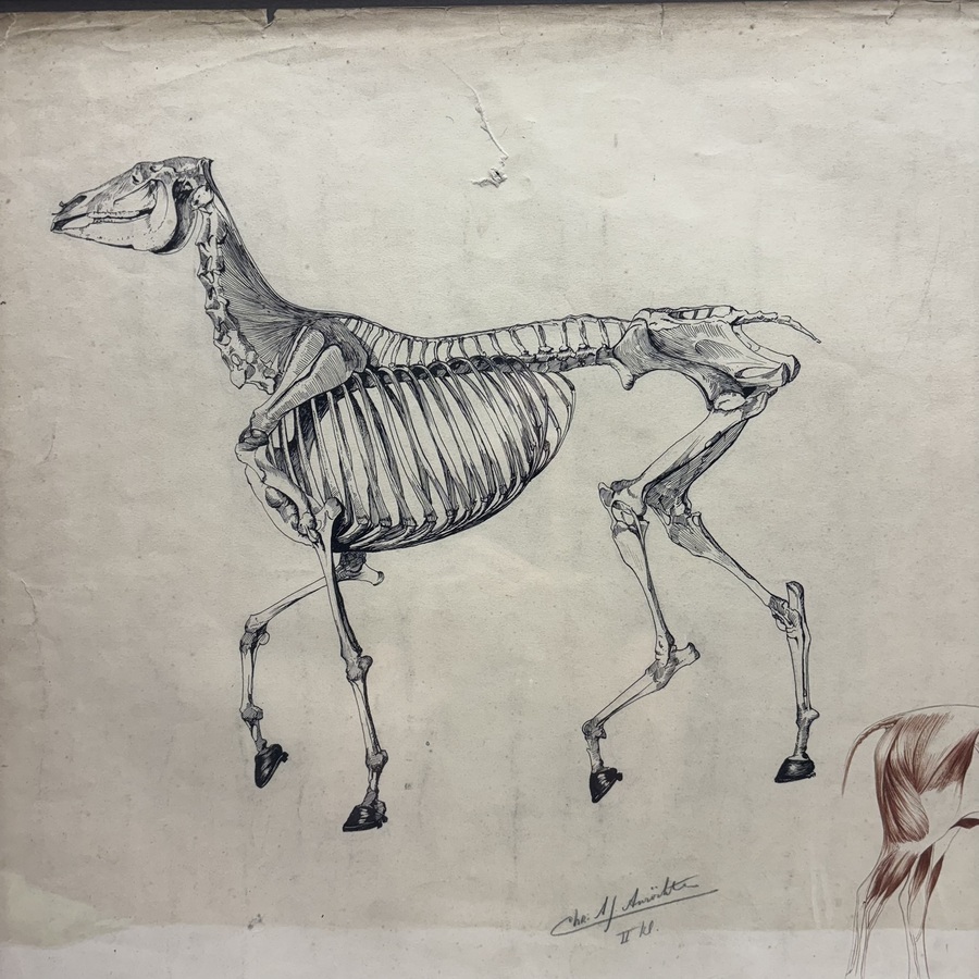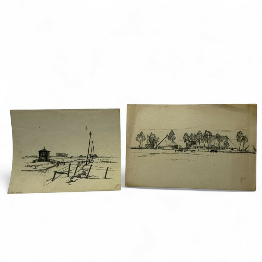 Bouke van der Sloot (1908-1995). Twee houtskool tekeningen Kop hals romp boerderij en gemaal in weidelandschap.