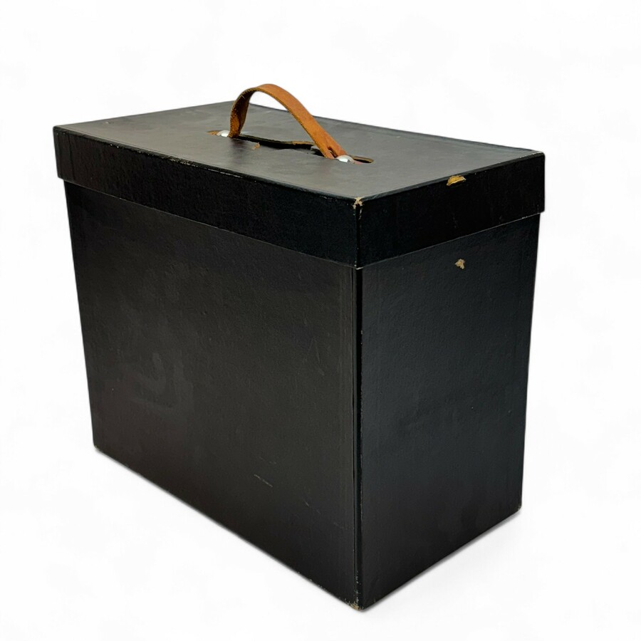 Een hoge hoed in doos en hierbij twee paar handschoenen
