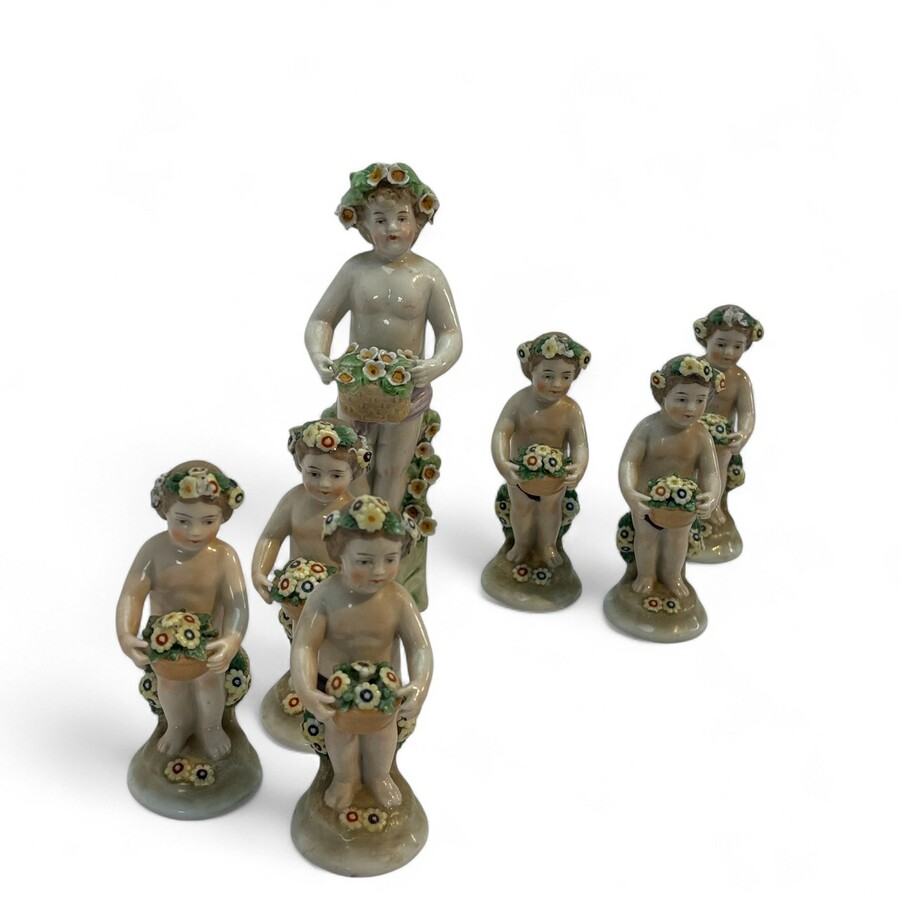 Zeven porseleinen beeldjes: bloemendragende kindjes