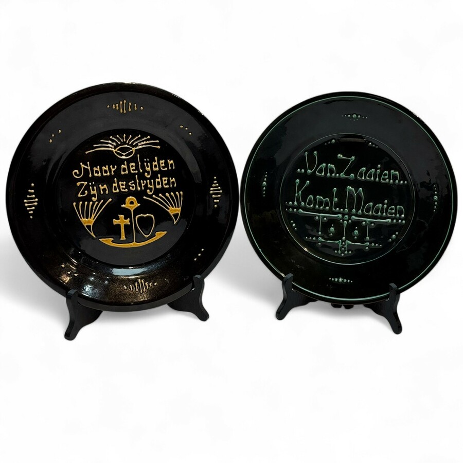 Twee aardewerken sierschotels met slibdecor