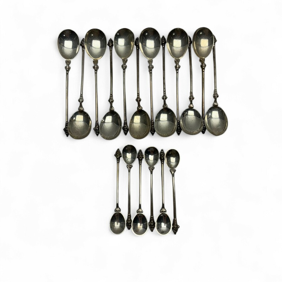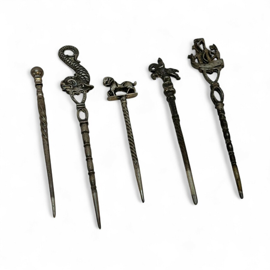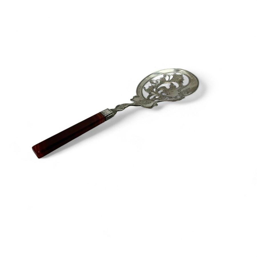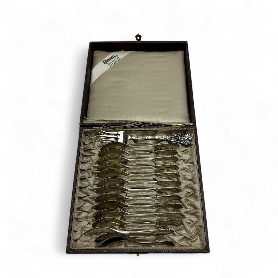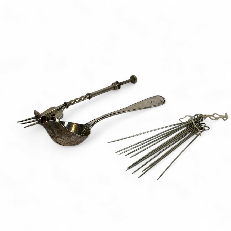 Zilveren vleesvork, serveerlepel, en set prikkers
