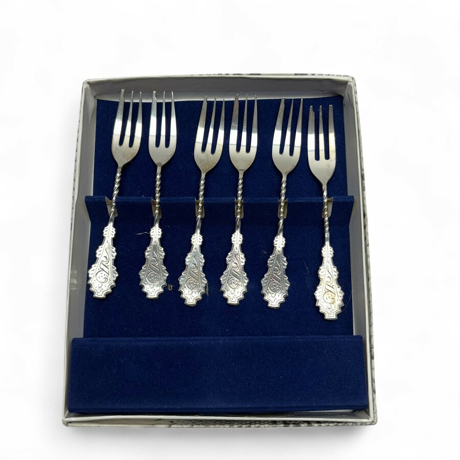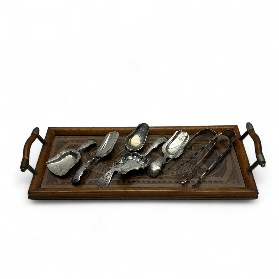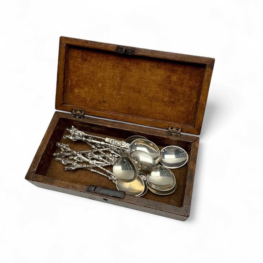 Twaalf tweede gehalte zilveren apostellepeltjes in een mahoniehouten lepeldoosje.