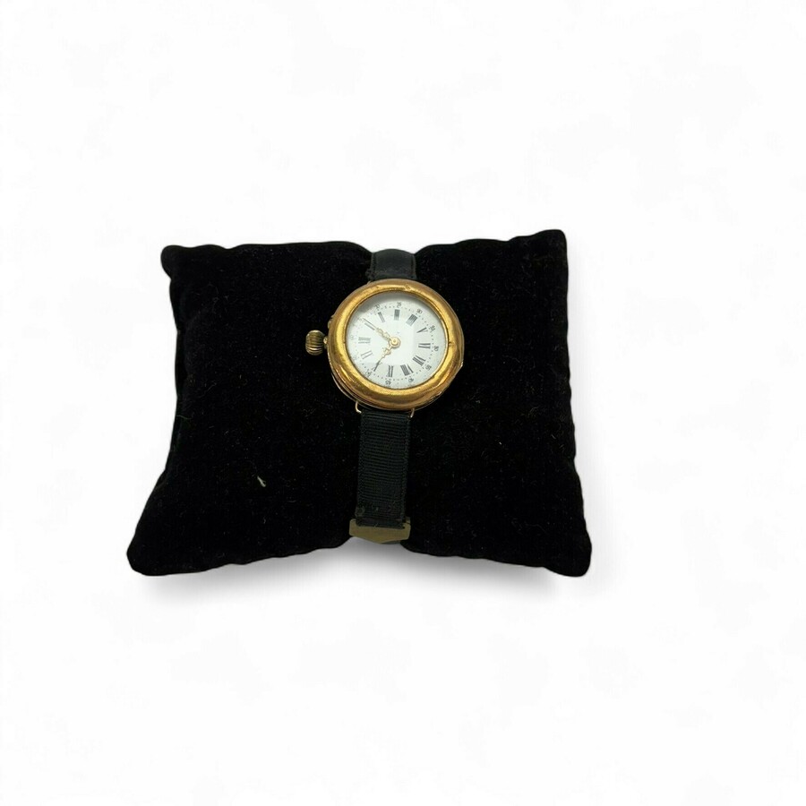 Rond 14 karaats gouden dameshorloge met geëmailleerde wijzerplaat, interieur met inscriptie: 'Remontoir Cylindre 6 Rubis', aan zwart stoffen bandje